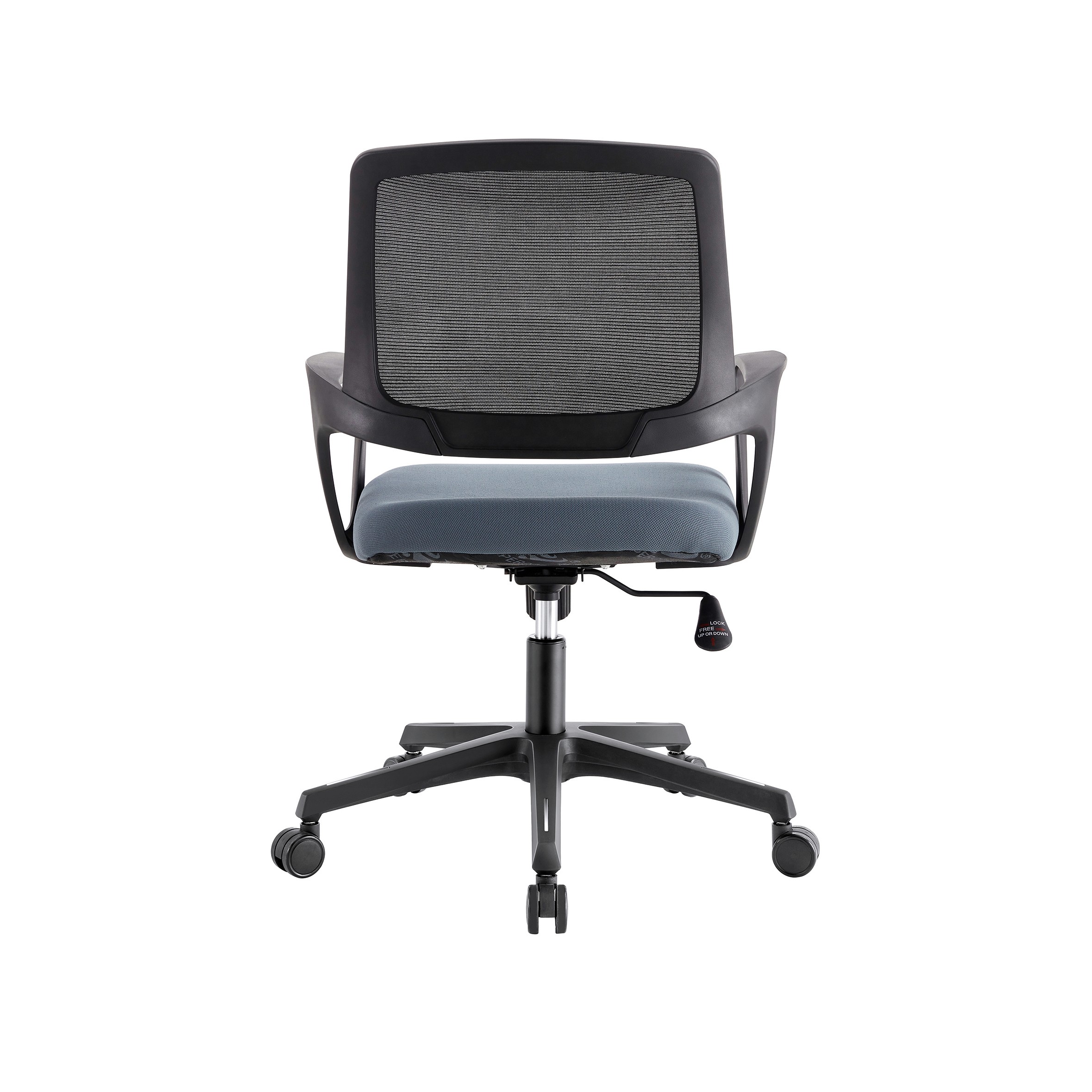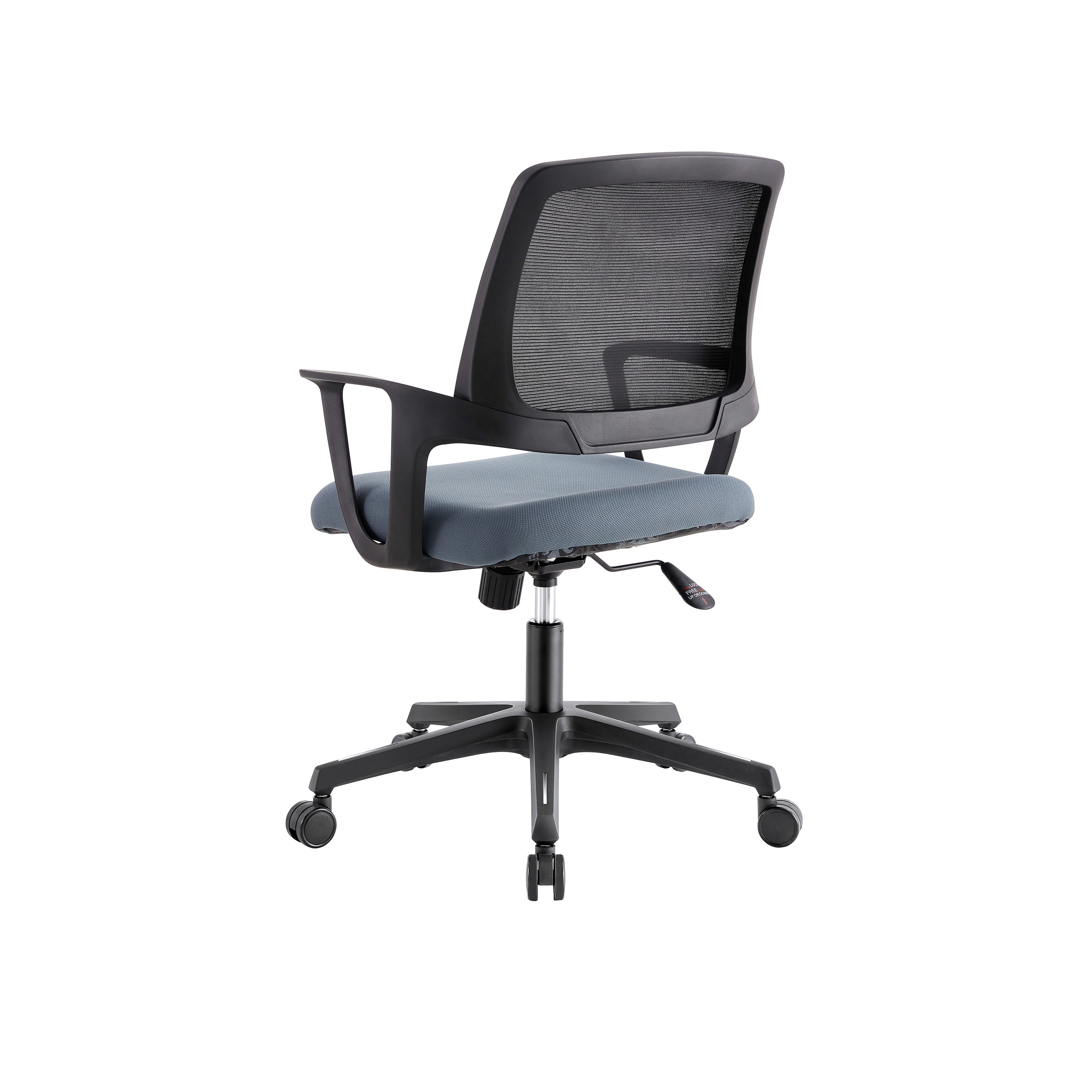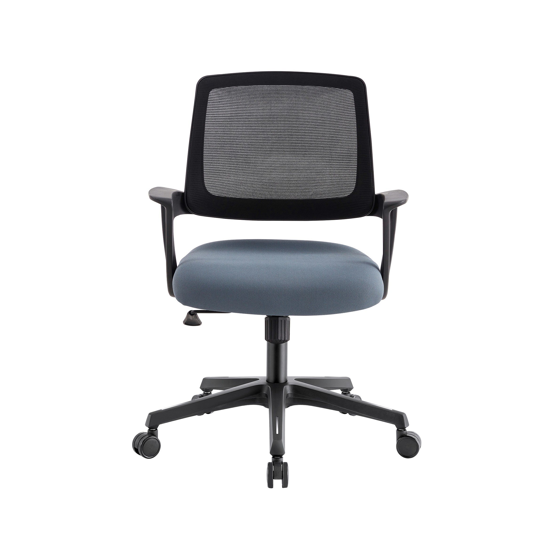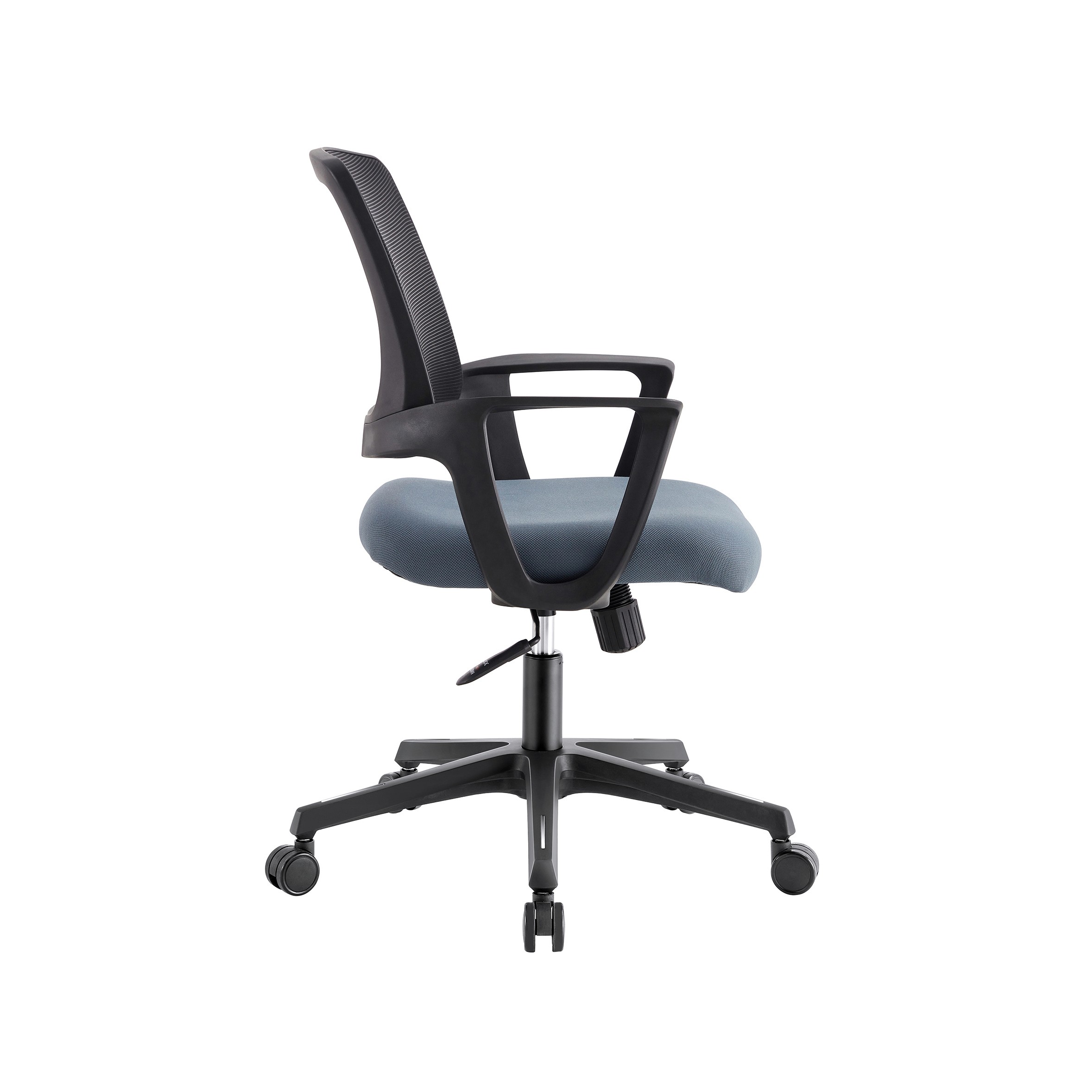 This is a sleek, compact office chair designed for efficiency and comfort in smaller workspaces. Breathable Mesh:High-tension mesh back for maximum airflow. Ergonomic Seat: Padded slate-blue cushion with a waterfall edge to support leg circulation. Fixed Armrests:Durable, integrated loop arms for a streamlined look. Full Mobility: 360° swivel with smooth-rolling casters and height adjustment. Best for: Home offices, student desks, or conference rooms.